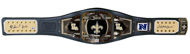 This New Orleans Saints WWE Championship Belt has been personally hand-signed by Rashid Shaheed with the added inscription "Geaux Saints!." It comes with an individually numbered, tamper-evident hologram from Beckett. To ensure authenticity, the hologram can be reviewed online. This process helps to ensure that the product purchased is authentic and eliminates any possibility of duplication or fraud.