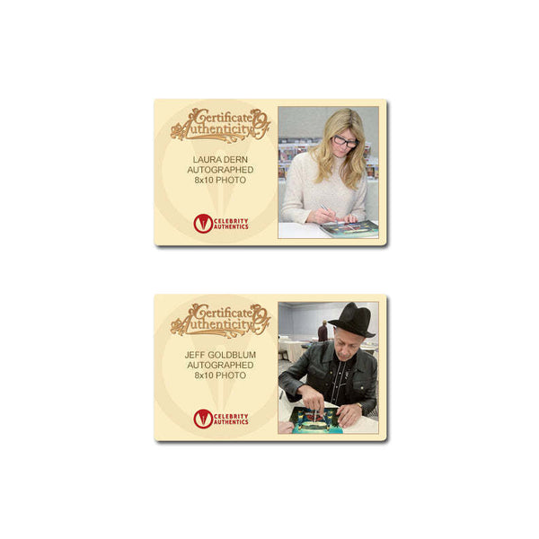 Celebrity Authentics is the exclusive source for Jurassic Park triple signed items by the original cast trio of Sam Neill, Laura Dern and Jeff Goldblum. The trio has signed cast items exclusively for Celebrity Authentics so be sure the item you choose is affixed with the Celebrity Authentics Authentication Hologram for their genuine signature.Celebrity Authentics is pleased to present this exclusive Welcome to Jurassic Park Framed Display featuring Autographed 8x10 Photo and License Plate with photo personally hand-signed by Sam Neill (Dr. Alan Grant), Jeff Goldblum (Dr. Ian Malcolm) and Laura Dern (Dr. Ellie Sattler) during their signings with Celebrity Authentics. This magnificent piece, with an approximate finished size 18"x14"x1.5", is from the only series of items ever released triple-signed by the original Jurassic trio and available exclusively from Celebrity Authentics! License Plate is made of metal and is a screen accurate replica of the one seen in the film. In Steven Spielberg's massive blockbuster, paleontologists Alan Grant (Sam Neill) and Ellie Sattler (Laura Dern) and mathematician Ian Malcolm (Jeff Goldblum) are among a select group chosen to tour an island theme park populated by dinosaurs created from prehistoric DNA. While the park's mastermind, billionaire John Hammond (Richard Attenborough), assures everyone that the facility is safe, they find out otherwise when various ferocious predators break free and go on the hunt. Display ships affixed with the Celebrity Authentics serial-numbered and tamper evident Authentication Hologram and includes Celebrity Authentics Certificates of Authenticity featuring pictures of each actor signing the photo. Framing: Photo is meticulously dry mounted and framed by the Celebrity Authentics Framing Studios using acid free backing and mat boards with white core for the finest in presentation. UV protective glass with precision cut moulding are used for smooth, clean frame edges, hand assembled in our studio. Additionally, a protective back cover is used to seal the piece with corner bumpers applied to protect your walls, providing adequate air flow. A hanger is affixed to complete the finished collectible. Each framed photo is carefully wrapped for shipping with double protective corners and cushioning to help ensure the item's safe arrival. Celebrity Authentics Framing Studios - acclaimed as the industry's finest! Please note: with multiples signed by the actor, a sample photo is used from stock to represent what you will receive. Exact autograph size and placement may vary.