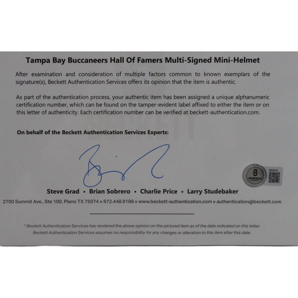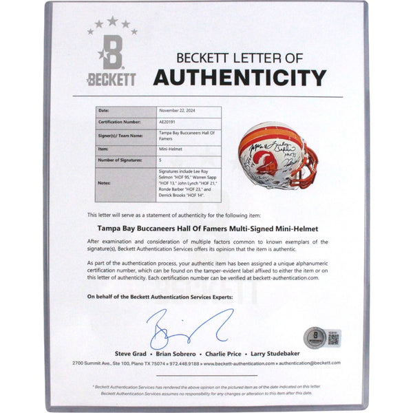 The number in the listing title is just an inventory sku for our records and is not the authentication number. The item pictured is the exact item you will receive, please see photos for condition. This is a Tampa Bay Buccaneers 1975-1996 Throwback Mini Helmet that was personally autographed by Lee Roy Selmon, Warren Sapp, John Lynch, Derrick Brooks, and Ronde Barber each athlete included the inscription "HOF". Includes a certificate of authenticity from Beckett Authentication Services (BAS) and Denver Autographs.FREE SHIPPING within the USA on orders over $10!