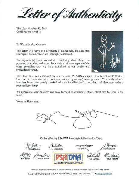 This is a Framed 8x10 Handdrawn Spiderman Sketch that has been Personally Signed & Autographed by Stan Lee. This item is 100% Authentic to include a Certificate of Authenticity (COA) / hologram by JSA Witness #W704535. This is a JSA Witnessed Protection Program item which means a JSA representative was present when this item was being signed. This item has been professionally framed with deluxe suede matting with spiderweb like inlays. The overall dimensions measure 19.5 x 23.5 inches. We offers a 100% Lifetime Guarantee on all Autographed & Signed Stan Lee memorabilia.
