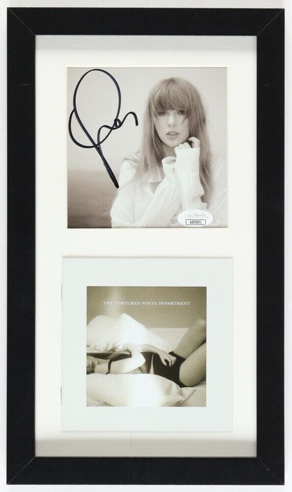 Custom frame measures approximately 8" x 13.5" in size. Features a "The Torture Poets Department" CD insert that has been hand-signed by Taylor Swift.The autograph(s) includes an official James Spence Authentication (JSA) hologram and matching COA for authenticity purposes.Authentication: JSA COA