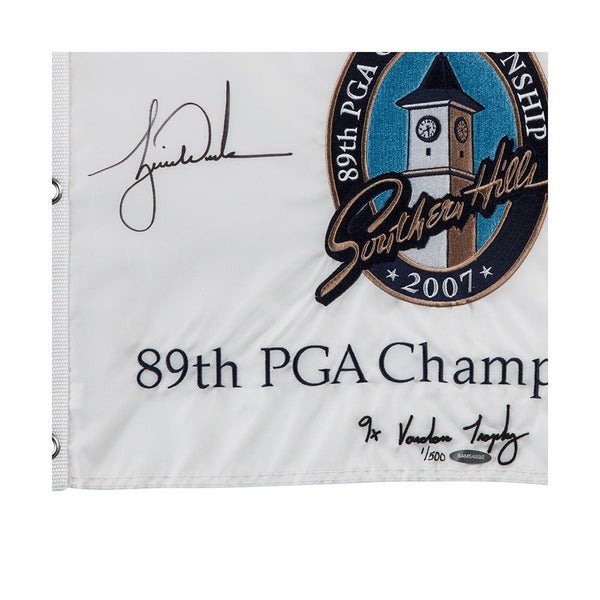 Awarded to the PGA Tour leader in scoring average, the Vardon Trophy has been given out by the PGA of America since 1937. It's named after Bailiwick of Jersey golfing great Harry Vardon, who won The Open Championship a record six times. Woods won the Vardon Trophy for the seventh time in his career in 2007. One of his most impressive wins of that season was his two-stroke win over Woody Austin in the PGA Championship held at Southern Hills Country Club in Tulsa, Oklahoma. After a lackluster opening-round 71, Woods carded a 63 on Friday to tie the record for the lowest single-round score at a major. He held on over the weekend to move to 13-0 in majors when leading or being tied for the lead after 54 holes. Woods physically wrote out the inscription "9x Vardon Trophy" and then UDA got that inscription embroidered directly onto the pin flag. Woods has signed this limited edition (500) 2007 PGA Championship pin flag in black paint pen. His signature is deemed authentic by virtue of Upper Deck Authenticated's Five-Step Process.