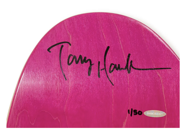 Tony Hawk Autographed Birdhouse Vulture Pink Stain Old School Skateboard Deck. This Birdhouse Vulture Pink Stain Old School skateboard deck is autographed by Tony Hawk. Hawk's signature was witnessed by an Upper Deck representative as part of UDA's 5-step authentication process. This item is limited to 50.Officially licensedThis product is guaranteed authentic and includes an Upper Deck Authenticated Certificate of Authenticity and an accompanying tamper-evident Hologram.MONEY BACK GUARANTEE!If for any reason you are not completely satisfied with the quality or authenticity of your purchase, we will gladly give you a full refund or exchange, whichever you prefer up to 30 days after purchase.