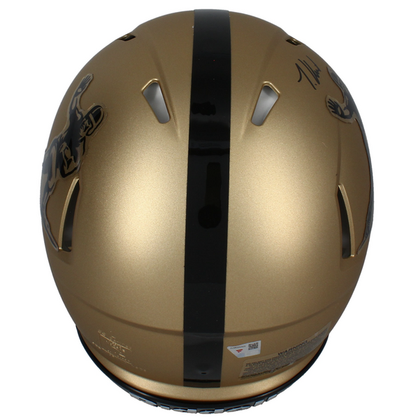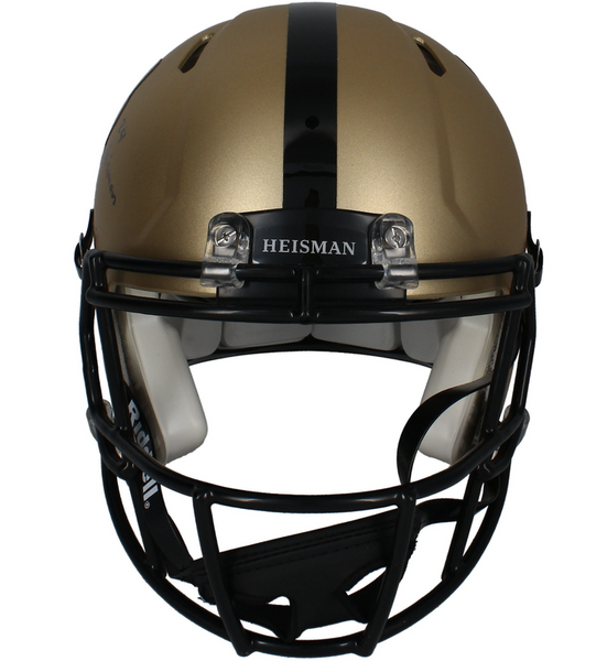 Travis Hunter Autographed /Inscribed "24 Heisman" Gold Heisman Trophy Logo Speed Authentic Helmet FanaticsThis Heisman logo authentic speed helmet has been personally hand-signed by Travis Hunter. It is officially licensed by the NCAA and comes with an individually numbered, tamper-evident hologram from Fanatics Authentic. To ensure authenticity, the hologram can be reviewed online. This process helps to ensure that the product purchased is authentic and eliminates any possibility of duplication or fraud.