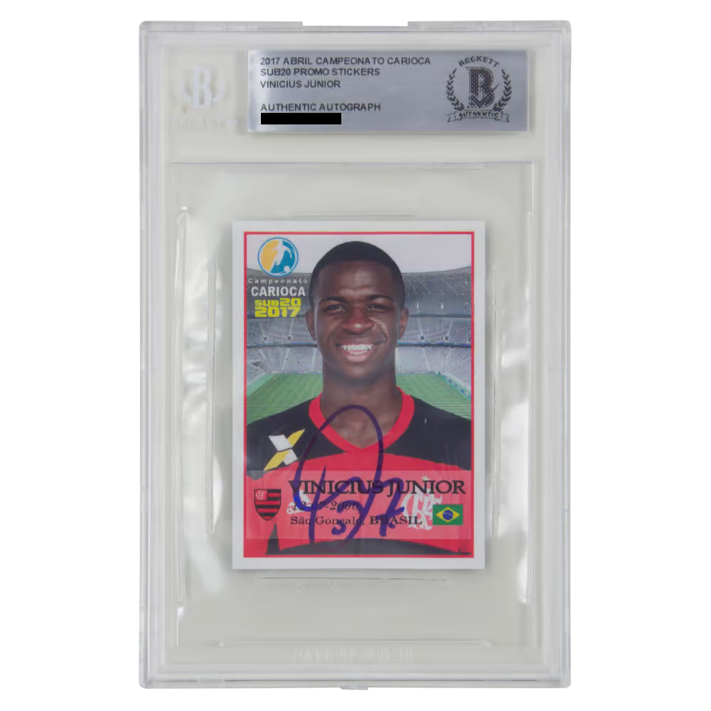 This is a Vinicius Jr Signed 2017 Abril Campeona to Carioca Rookie Card - BGS Authentic. THE ITEM IN THE PICTURE IS A STOCK IMAGE. YOU WILL RECEIVE AN IDENTICAL ITEM OF EQUAL QUALITY. ALL JERSEYS ARE SIZE LARGE. Every item of signed memorabilia we sell is official and of the highest quality. We pride ourselves on providing sports fans with the most exclusive signed memorabilia on the market. We are an industry leading signed memorabilia company who can guarantee 100% authenticity on every signature we sell. The item you receive will be identical to the one you are seeing in the stock pictures. This includes the item, the authentication company, signature color and signature placement. We take pride in ensuring the authenticity of all our items. With unwavering commitment, we guarantee that every signature is 100% authentic. Every item of signed memorabilia comes with a scannable barcode which takes you to the certificate of authenticity on the company's website. These industry leading authentication companies include Beckett Authentication Services, James Spencer Authentication Services and Professional Sports Authentication Services.