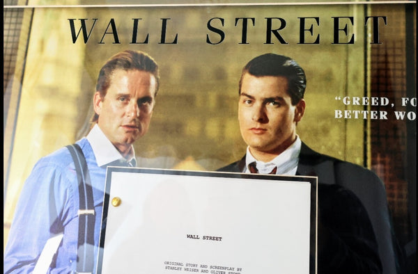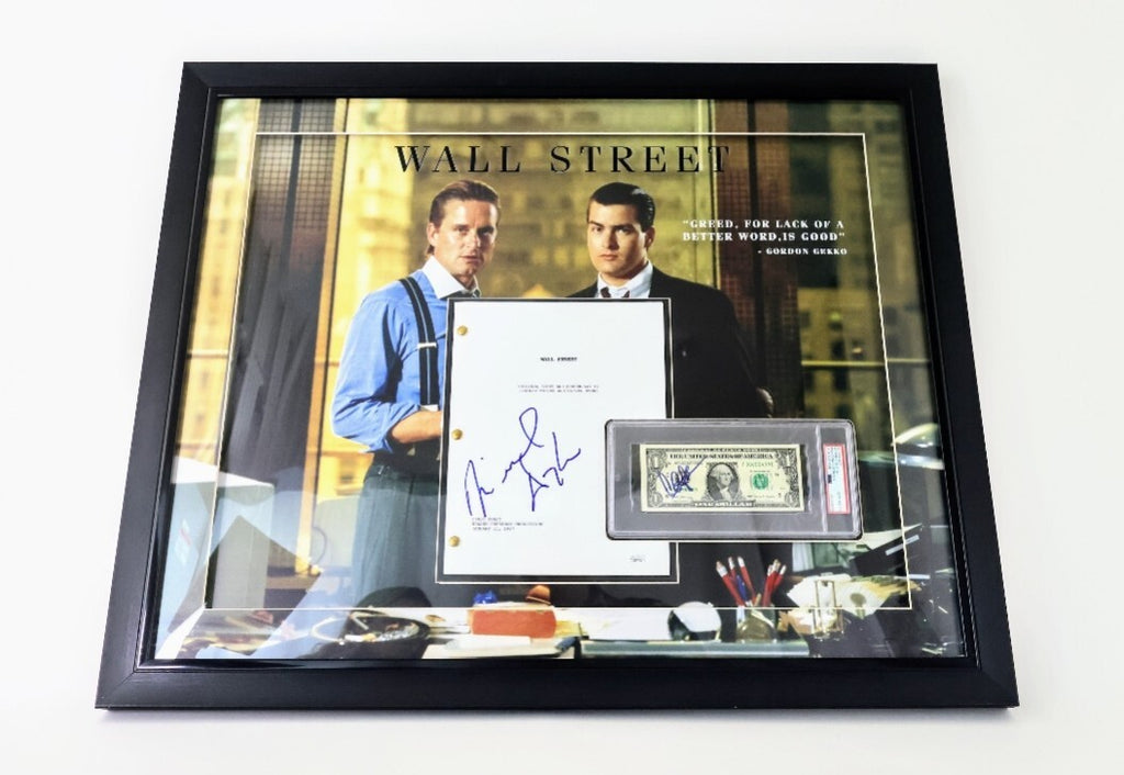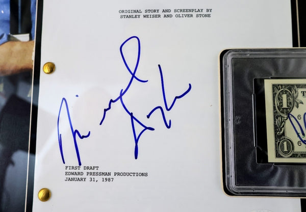 Elevate your memorabilia collection with this exclusive piece - a framed "Wall Street" screenplay and dollar bill, personally signed by iconic actors Michael Douglas and Charlie Sheen. Immerse yourself in the world of high finance as you showcase this unique collector's item that captures the essence of the classic film. Key Features: Authentic Signatures: Each screenplay and dollar bill is personally autographed by Michael Douglas and Charlie Sheen, respectively, adding unparalleled value and authenticity to your collection. Frame Size: 33x27 Framed Elegance: The screenplay and dollar bill are expertly framed, providing a stylish and protective display for your cherished memorabilia. The frame complements the sophistication of the "Wall Street" theme. "Wall Street" Screenplay: Own a piece of cinematic history with the full screenplay from the iconic film, capturing the drama, power, and intrigue of the financial world. Genuine Dollar Bill: The inclusion of a genuine dollar bill adds a tangible connection to the film's theme, creating a unique and conversation-worthy piece. Certificate of Authenticity: Your purchase comes with a JSA Certificate of Authenticity, ensuring the genuine nature of the signatures and the memorabilia. Perfect Gift: Ideal for movie enthusiasts, collectors, or anyone captivated by the allure of Wall Street. Surprise a loved one with this extraordinary and timeless gift.Tags:#WallStreet #MichaelDouglas #CharlieSheen #SignedScreenplay #MovieMemorabilia #Collectibles #FramedArt #AutographedDollarBill #IconicFilm #FinanceEnthusiast #GiftIdeas #UniqueDecor #CelebrityAutographs #CinematicHistoryHashtags:#WallStreetCollectible #MovieMemorabilia #MichaelDouglasAutograph #CharlieSheenSignature #FramedScreenplay #DollarBillArt #IconicCinema #CollectorsItem #GiftForMovieLovers #FinanceArt #LimitedEdition #CelebritySigned #HollywoodLegends