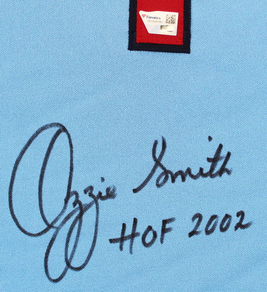 This Autographed Light Blue Mitchell & Ness Jersey has been Personally Signed by Ozzie Smith of the St. Louis Cardinals. This item is 100% Authentic to includes a numbered hologram by Fanatics. We conducted an autograph signing with Ozzie Smith where multiples of the same item were signed. While the photographs are representative of this item, the size, placement and strength of the signature may vary. Each item is hand signed, therefore, each autograph is unique. This item can be verified through Fanatics. This is a X-Large sized Jersey.