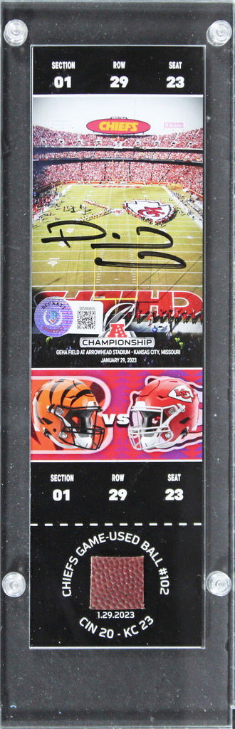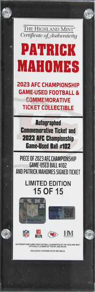 This Autographed w/ Game Used Ball #102 Swatch Limited Edition #15/15 January 29, 2023 AFC Championship Replica Ticket Stub has been Personally Signed by Patrick Mahomes of the Kansas City Chiefs. This item is 100% Authentic to include a hologram by Beckett Authentication Services. This item will come with an affixed Beckett Authentication Services (BAS) authentication sticker, which includes a scannable QR code to verify authenticity. Please note that Beckett no longer provides serial-numbered COA cards, and the attached BAS sticker will serve as the complete authentication for this item. This is a BAS Witnessed Protection Program item which means a Beckett Authentication Service representative was present when this item was being signed. The authenticity can be verified on Beckett Authentication Services website.