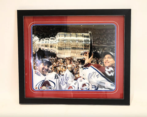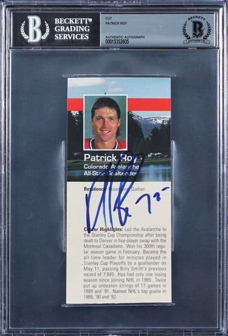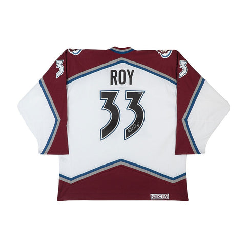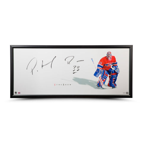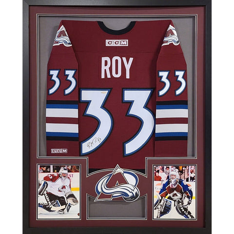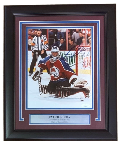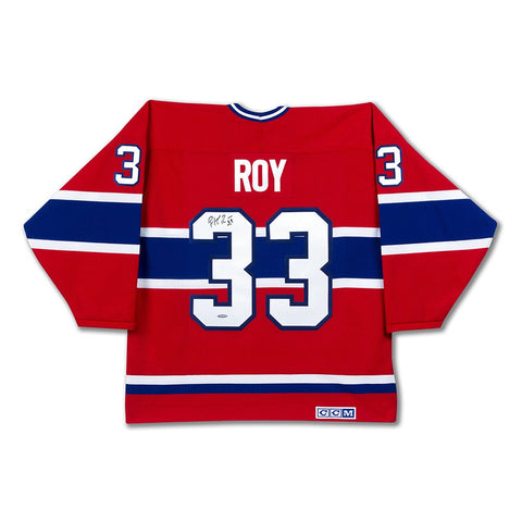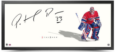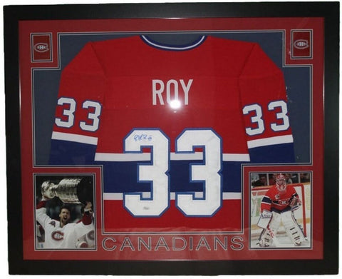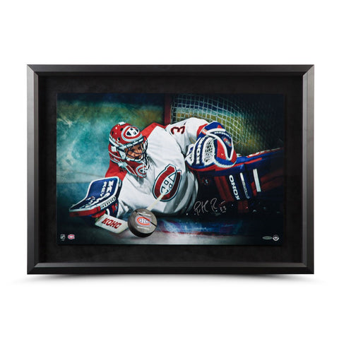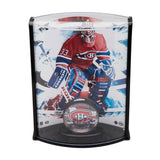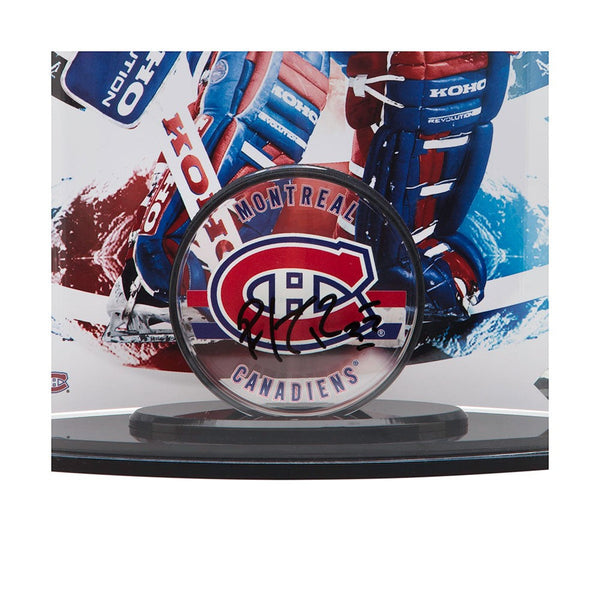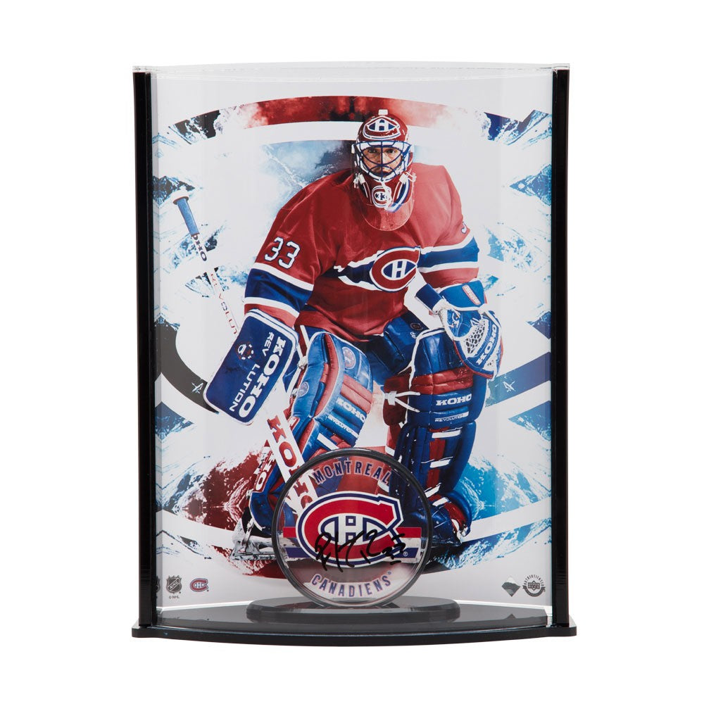Patrick Roy is the only player in National Hockey League to win the Conn Smythe Trophy, awarded to the MVP of the Stanley Cup® playoffs, a record three times. Roy had his number retired by both the Montreal Canadiens and Colorado Avalanche. In his second season with the Canadiens he played in 47 games and earned the starting position for the playoffs. Roy was then named the MVP of the playoffs and brought an unexpected Stanley Cup® title to Montreal. This 8" x 10" image shows Roy in a Montreal Canadiens jersey, ready to make another save. Roy has signed a Montreal Canadiens acrylic hockey puck in this vertical Montreal Canadiens puck display in black paint pen. The autographed puck rests inside our patented curve display. His signature is deemed authentic by virtue of Upper Deck Authenticated's Five Step Process.