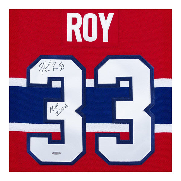 Patrick Roy had his name put on the Stanley Cup® for the first time at the age of 20. A legendary player who helped the Montreal Canadiens stay relevant in the playoffs, Roy recorded over 200 playoff games. In 1993 Roy won another Stanley Cup® with the Montreal Canadiens as well as the Conn Smythe Trophy. Roy retired as the NHL's® all-time winningest goaltender with 551 wins and also earned five Jennings Trophies. In his first year of eligibility, Roy was inducted into the Hockey Hall of Fame in 2006. Roy has inscribed "HOF 2006" and signed the back of this authentic red Montreal Canadiens jersey in black paint pen. Roy's signature was witnessed under UDA's Five Step Authentication Prcoess.