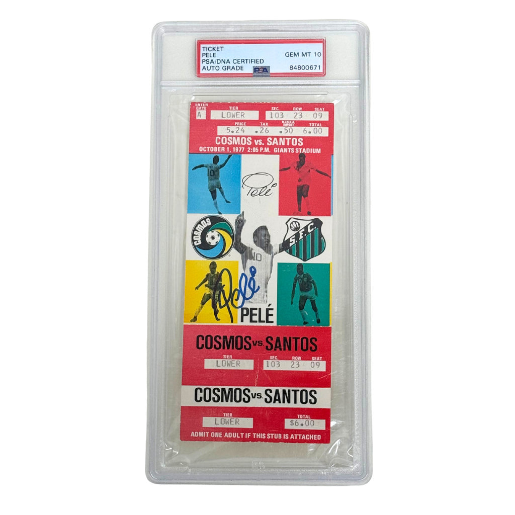 This is a Pele Signed 1977 Final Pro Game New York Cosmos Full Match Ticket - PSA AUTH. THE ITEM IN THE PICTURE IS A STOCK IMAGE. YOU WILL RECEIVE AN IDENTICAL ITEM OF EQUAL QUALITY. ALL JERSEYS ARE SIZE LARGE. Every item of signed memorabilia we sell is official and of the highest quality. We pride ourselves on providing sports fans with the most exclusive signed memorabilia on the market. We are an industry leading signed memorabilia company who can guarantee 100% authenticity on every signature we sell. The item you receive will be identical to the one you are seeing in the stock pictures. This includes the item, the authentication company, signature color and signature placement. We take pride in ensuring the authenticity of all our items. With unwavering commitment, we guarantee that every signature is 100% authentic. Every item of signed memorabilia comes with a scannable barcode which takes you to the certificate of authenticity on the company's website. These industry leading authentication companies include Beckett Authentication Services, James Spencer Authentication Services and Professional Sports Authentication Services.
