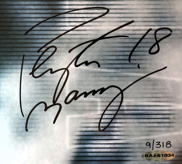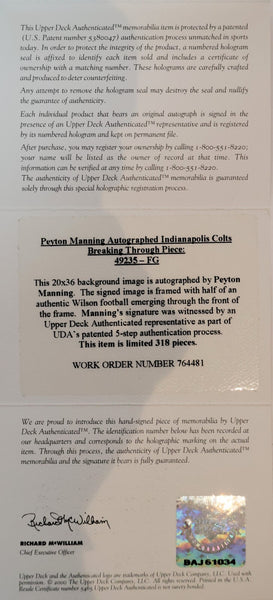 The product is a Peyton Manning autographed photo titled "Breaking Through," authenticated by Upper Deck. The photo features the former Indianapolis Colts quarterback and comes with a Certificate of Authenticity from Upper Deck. This collectible piece is an original autographed item, perfect for any football fan or sports memorabilia enthusiast looking to add a unique and valuable piece to their collection.Framed size: 27.5x43.5