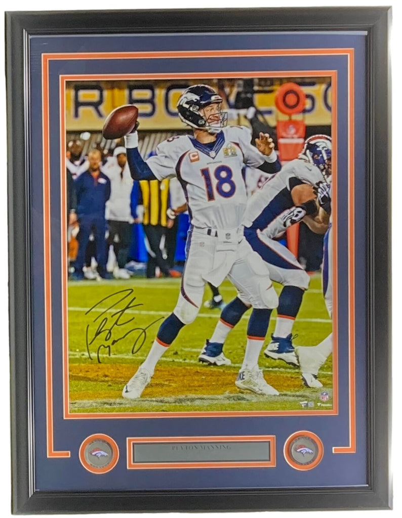 Featured is a Peyton Manning Denver Broncos signed framed 16x20 photo. This photo was hand signed by Peyton Manning in and has been authenticated by Fanatics authentication services. Included with the photo is a Fanatics hologram and certificate of authentication. Brand new professional framing featuring double matting and engraved nameplate. The frame measures approximately 22x27 in total size, and it is ready for display. This item would make a great additional to any sports memorabilia collection.. SPECIFICATIONS Autographed By: Peyton Manning Team: Denver Broncos Sport: Football Authentication: Fanatics Authentic