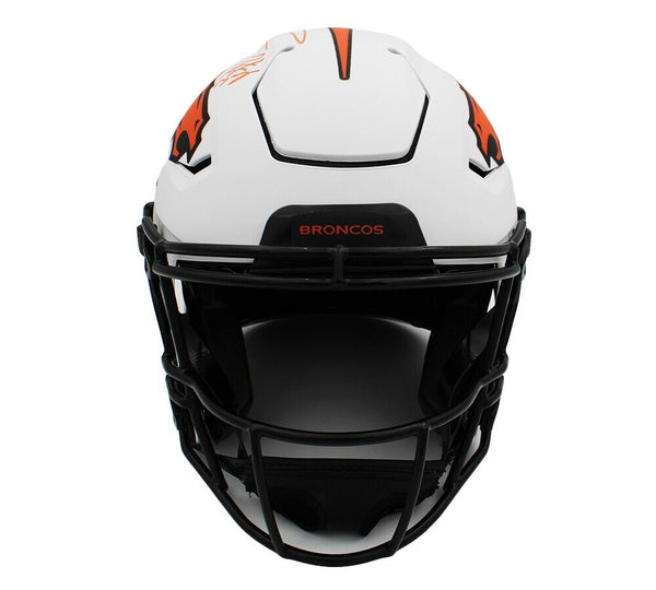An Denver Broncos Speed Flex Authentic Lunar NFL Helmet hand signed by Peyton Manning & Russell Wilson. The item and signature are in excellent condition. Peyton was drafted into the NFL 1998 in Round:1,Pick:1. Peyton is a 2x Super Bowl Champion, a Super Bowl MVP, 5x NFL Offensive Player of the Year, and 7x First-team All-Pro. Russell was drafted into the NFL in 2012. He is a Super Bowl champion, a Walter Payton NFL Man of the Year a Second-team All-Pro 8x Pro Bowler. AUTHENTICATION: The item is accompanied by a Fanatics Authentic Certificate of Authenticity - Fanatics Authentic Serial Numbered and Databased Hologram