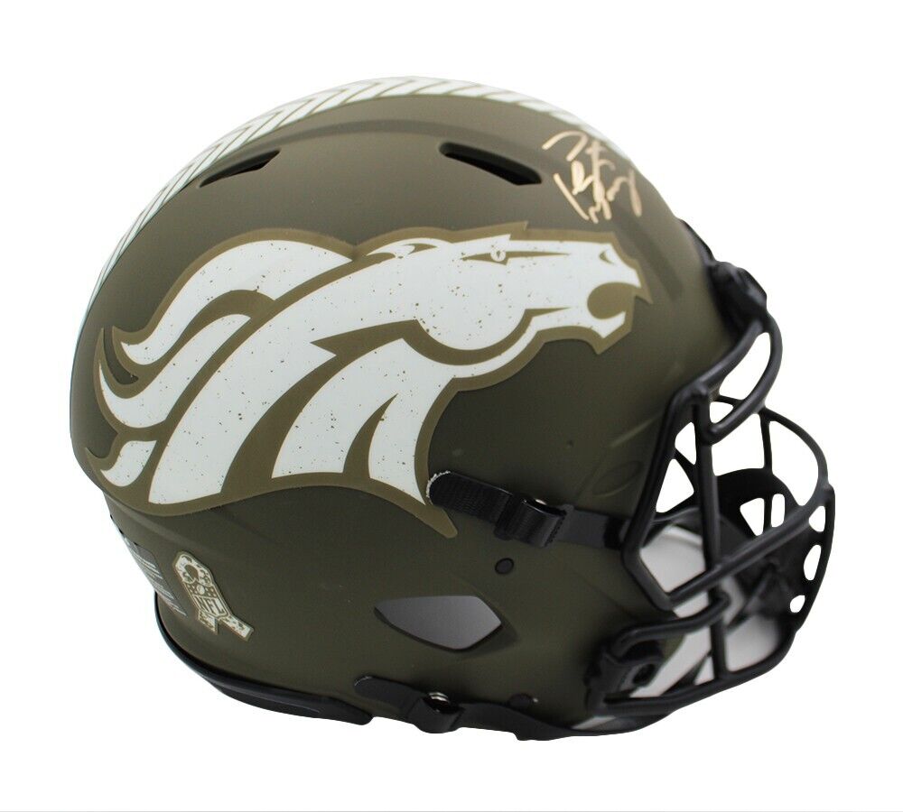 A Denver Broncos Speed Authentic Salute To Service NFL Helmet hand signed by Peyton Manning. The item and signature are in excellent condition. Peyton was drafted into the NFL 1998 in Round:1,Pick:1. Peyton is a 2x Super Bowl Champion, a Super Bowl MVP, 5x NFL Offensive Player of the Year, and was NFL comeback player of the Year in 2012. AUTHENTICATION: The item is accompanied by a Fanatics Authentic Serial Numbered and Databased Hologram