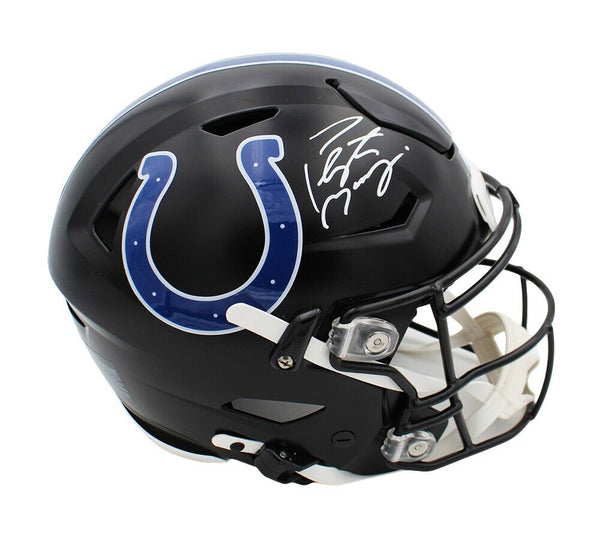 An Indianapolis Colts Speed Flex Authentic Black NFL Helmet hand signed by Peyton Manning. The item and signature are in excellent condition. Peyton is 14x Pro Bowler, 7x First Team All-Pro Selection, Super Bowl Champion and MVP, 5x NFL MVP, and Future Hall of Fame inductee. AUTHENTICATION: The item is accompanied by a Fanatics Authentic Serial Numbered and Databased Hologram