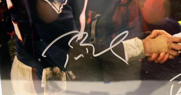 Celebrate one of the most iconic rivalries in NFL history with this stunning Tom Brady & Peyton Manning autographed 23x27 framed photo. Capturing a moment of sportsmanship and respect, this piece immortalizes the postgame handshake between two of football's greatest quarterbacks. Perfect for any sports enthusiast, this collectible is a must-have for fans of the New England Patriots, Indianapolis Colts, or the sport itself. Product Features: Dual Autographs: Hand-signed by both Tom Brady and Peyton Manning, each autograph is authenticated, ensuring you receive a genuine piece of sports memorabilia. High-Quality Framing: Measuring 23x27 inches, the photo is beautifully framed, making it a standout piece for your home, office, or fan cave. Iconic Moment: The photograph captures the legendary postgame handshake, symbolizing the mutual respect and fierce competition between Brady and Manning. Certificate of Authenticity: Comes with a Certificate of Authenticity (COA), providing verification and peace of mind for collectors. Perfect Gift: An exceptional gift for any football fan, memorabilia collector, or admirer of these two legendary quarterbacks. Add a piece of NFL history to your collection with this exclusive Tom Brady & Peyton Manning autographed photo. Order now and celebrate the legacy of two of the greatest quarterbacks to ever play the game!