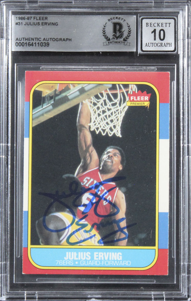This Autographed Auto Graded Gem Mint 10! 1986 Fleer #31 Card has been Personally Signed by Julius "Dr. J." Erving of the Philadelphia 76ers. This item is 100% Authentic, it comes slabbed and authenticated by Beckett Authentication Services. We have multiples of this same item. While the photographs are representative of this item, the size and placement of the signature may vary. Each item is hand signed, therefore, each autograph is unique.