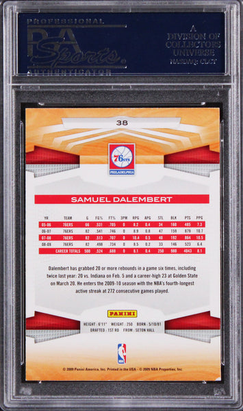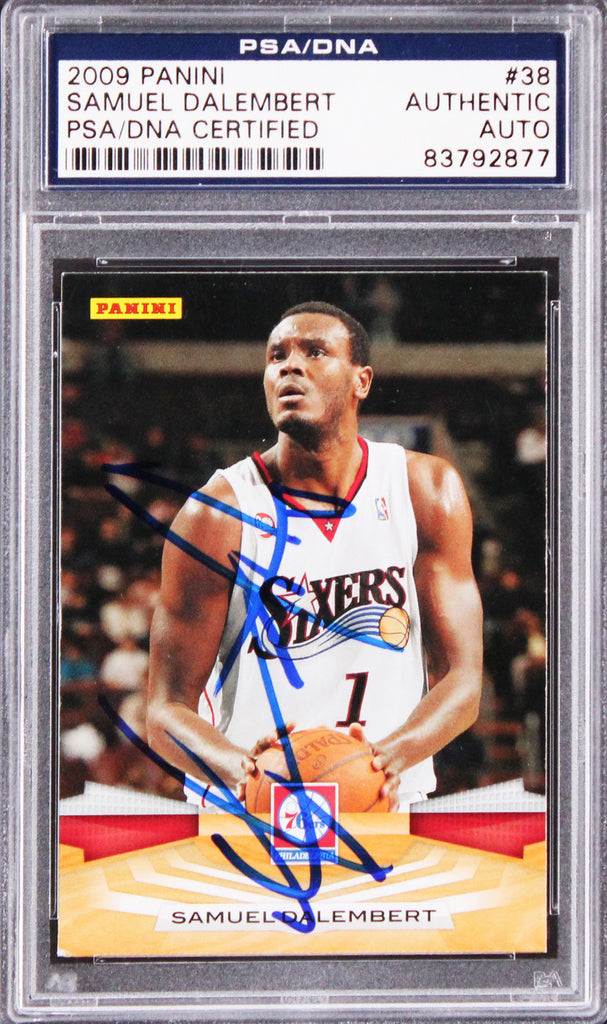 This Autographed 2009 Panini #38 Card has been Personally Signed by Samuel Dalembert of the Philadelphia 76ers. This item is 100% Authentic, it comes slabbed and authenticated by PSA/DNA. The authenticity can be verified on Professional Sports Authenticator website.