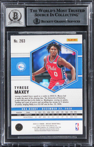 This Autographed Auto Graded Gem Mint 10! 2020 Panini Mosaic #263 Rookie Card has been Personally Signed by Tyrese Maxey of the Philadelphia 76ers. This item is 100% Authentic, it comes slabbed and authenticated by Beckett Authentication Services. The authenticity can be verified on Beckett Authentication Services website.