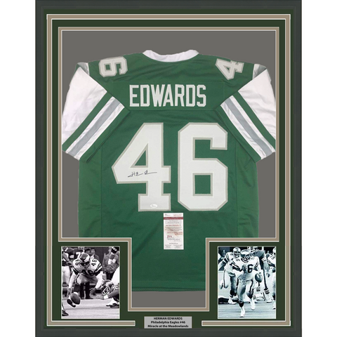 Framed Autographed/Signed Herman Herm Edwards 33x42 Green Jersey JSA COA