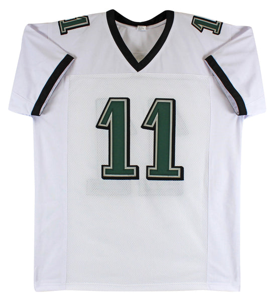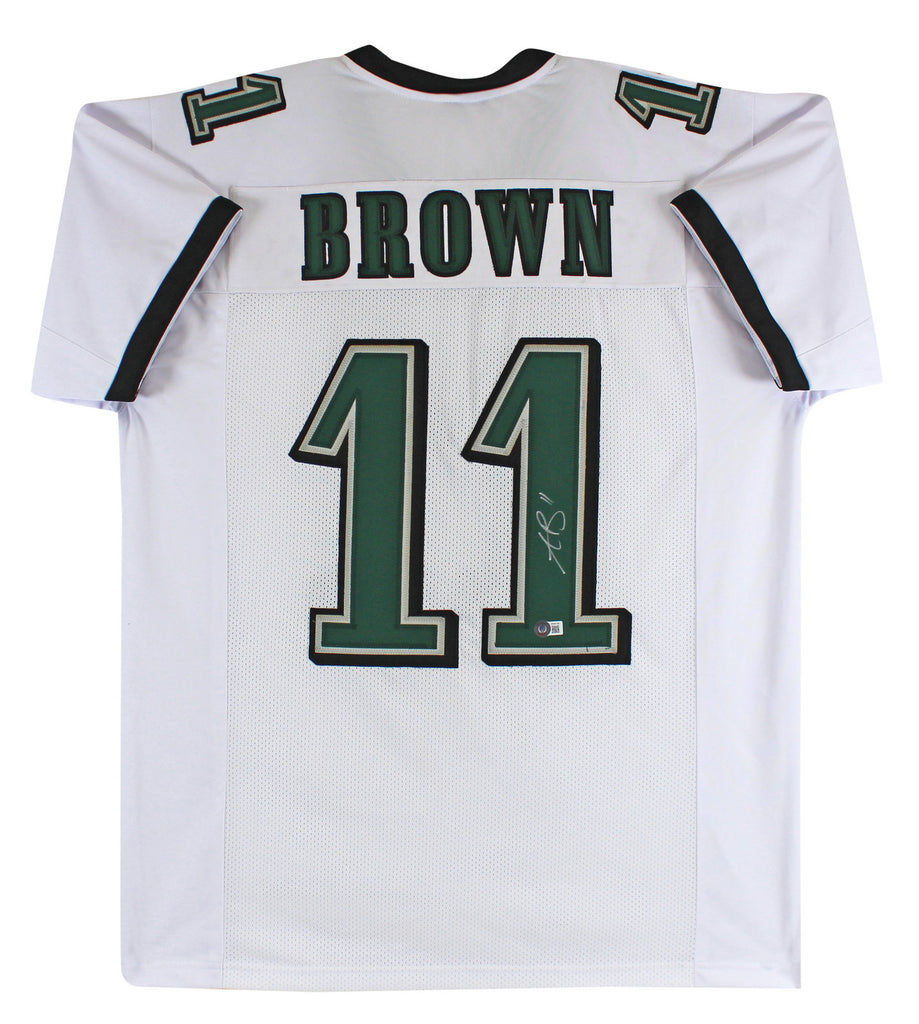 This Autographed White Pro Style Jersey has been Personally Signed by A.J. Brown of the Philadelphia Eagles. This item is 100% Authentic to include a hologram by Beckett Authentication Services. This item may come with the new Beckett Authentication hologram that has a scannable QR code rather than the traditional COA. If you would like to have a COA, you are welcome to reach out to Beckett for a printed certification once you receive your item. This is a BAS Witnessed Protection Program item which means a Beckett Authentication Service representative was present when this item was being signed. We conducted an autograph signing with A.J. Brown where multiples of the same item were signed. While the photographs are representative of this item, the size, placement and strength of the signature may vary. Each item is hand signed, therefore, each autograph is unique. This item can be verified through BAS Witnessed. This is a X-Large sized, non-branded, custom-stitched Jersey.