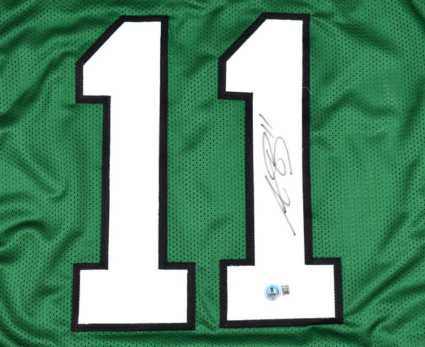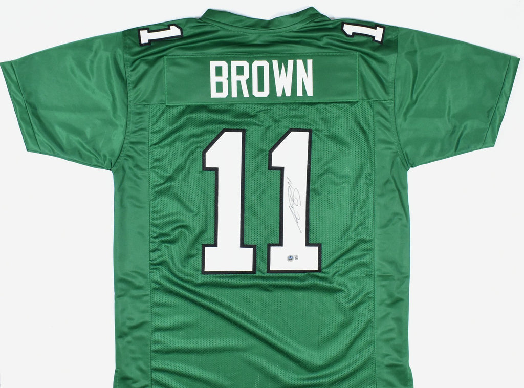 THIS IS NOT AN NFL JERSEY. THIS HAS NO TAGS, NO LOGOS, NO EMBLEMS. This is a hand autograph of A.J. Brown of the Philadelphia Eagles on a Custom Made (non name brand) Authentic Style Jersey with stitched letters and numbers. This item has a Beckett Witnessed Authentication, which comes with a Beckett numbered sticker hologram and a QR Code for verification. You can view this item on the Beckett Authentication website. It was signed either at a public autograph appearance or a private signing. This is a stock photo of the item. Although you may not receive this exact item, the item you receive is virtually identical and brand new in great shape. Jersey size is XL. THIS IS NOT AN NFL JERSEY. THIS HAS NO TAGS, NO LOGOS, NO EMBLEMS. This is a hand autograph of A.J. Brown of the Philadelphia Eagles on a Custom Made (non name brand) Authentic Style Jersey with stitched letters and numbers. This item has a Beckett Witnessed Authentication, which comes with a Beckett numbered sticker hologram and a QR Code for verification. You can view this item on the Beckett Authentication website. It was signed either at a public autograph appearance or a private signing. This is a stock photo of the item. Although you may not receive this exact item, the item you receive is virtually identical and brand new in great shape. Jersey size is XL.