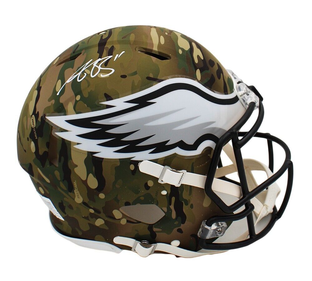 A Philadelphia Eagles Speed Authentic Camo NFL Helmet hand signed by AJ Brown. The item and signature are in excellent condition. AJ is wide receiver for the Philadelphia Eagles. He was drafted into the NFL in 2019 by the Tennessee Titans. He played college football for Ole Miss. AUTHENTICATION: The item is accompanied by a Beckett Serial Numbered and Databased Hologram.