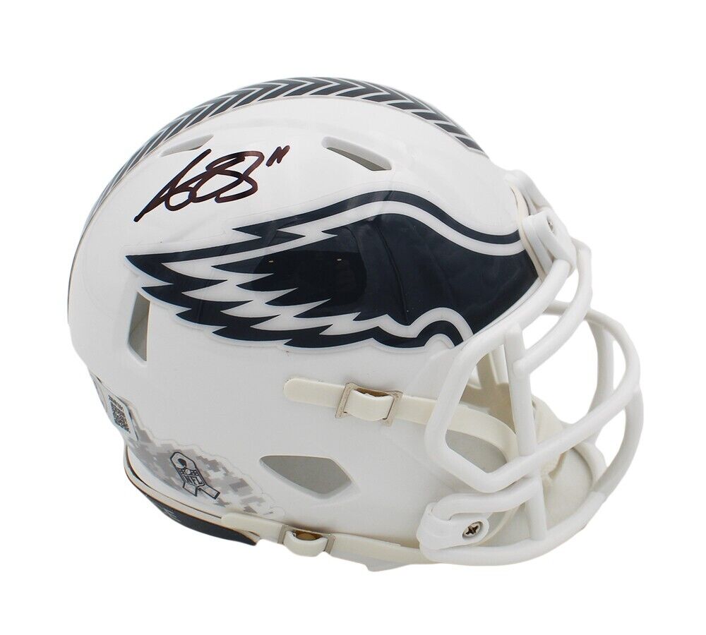 A Philadelphia Eagles Speed Salute to Service 3 NFL Mini Helmet hand signed by AJ Brown. The item and signature are in excellent condition. AJ is wide receiver for the Philadelphia Eagles. He was drafted into the NFL in 2019 by the Tennessee Titans. He played college football for Ole Miss. AUTHENTICATION: The item is accompanied by a Beckett Serial Numbered and Databased Hologram.