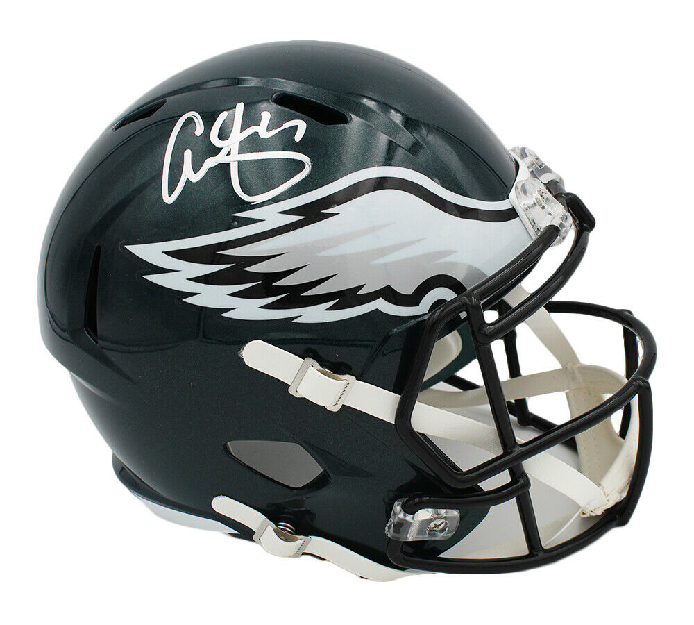 A Philadelphia Eagles Speed Replica NFL Helmet hand signed by Alshon Jeffery. The item and signature are in excellent condition. Alshon is a Super Bowl Champion, Pro Bowler, and First-Team All-American. AUTHENTICATION: The item is accompanied by a Certificate of Authenticity Serial Numbered and Databased Hologram - Picture of Alshon from the signing