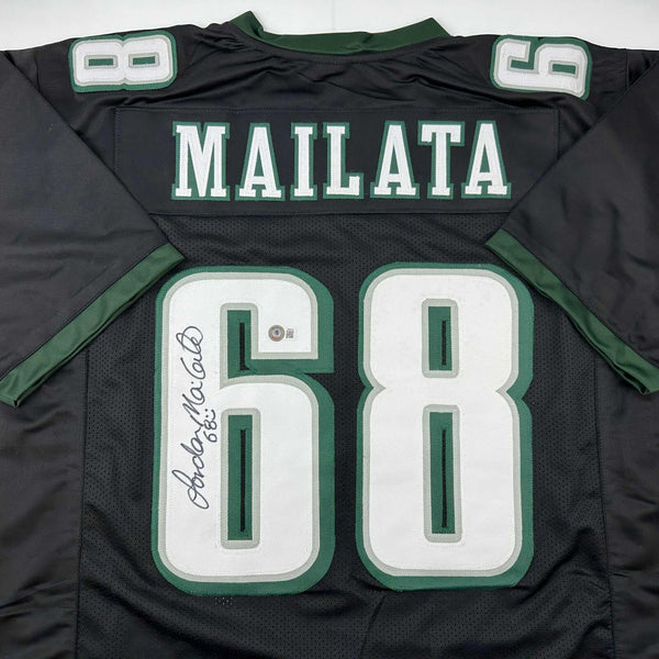 Autographed/Signed Jordan Mailata Philadelphia Black Jersey Beckett BAS COA Jersey has no brand names or logos. This is a custom jersey and was not manufactured by or in any manner associated with any professional sports league or manufacturer. This custom jersey carries no professional sports league designation. The item is intended to be an autographed collectible. The custom jersey displays the name and number of the player. This item in no way is affiliated with or connected to any professional sports organization. Size is XL.