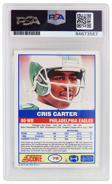 Cris Carter signed Philadelphia Eagles 1989 Score football rookie card #72 with 'HOF 13' inscription. The card has been authenticated and encapsulated by PSA and the autograph has been given a GEM Mint 10 auto grade. The authentication number can be verified online. Only the autograph has been graded a 10 by PSA, the card itself is ungraded. The image of the item is a stock photo, as we may have multiples of the item in stock. The Slabbed Card you will receive will be of the card described. (Same grade, Same authentication) You may or may not receive the exact PSA serial number on the slab label shown in image.