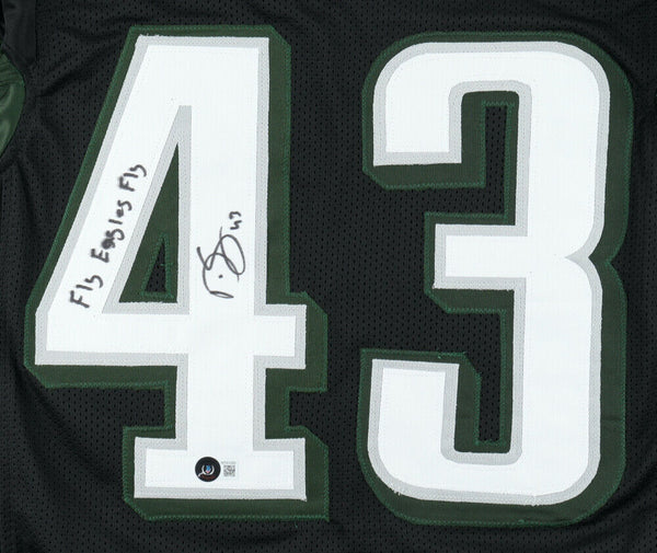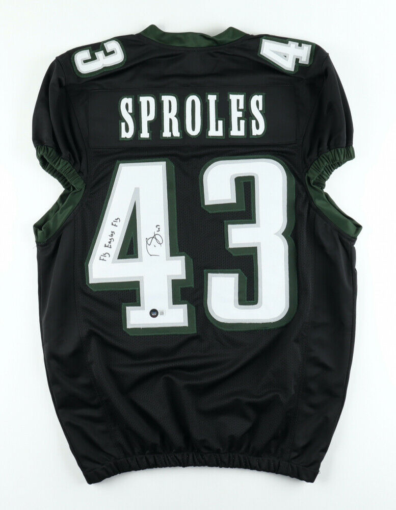 Custom on-field style jersey. Everything sewn on, size XL. Hand-signed by Darren Sproles.The lot / autograph(s) includes an official Beckett Authentication Services serially-numbered hologram and matching COA for authenticity purposes. The signing of this item was witnessed by Beckett. Authentication: Beckett COA