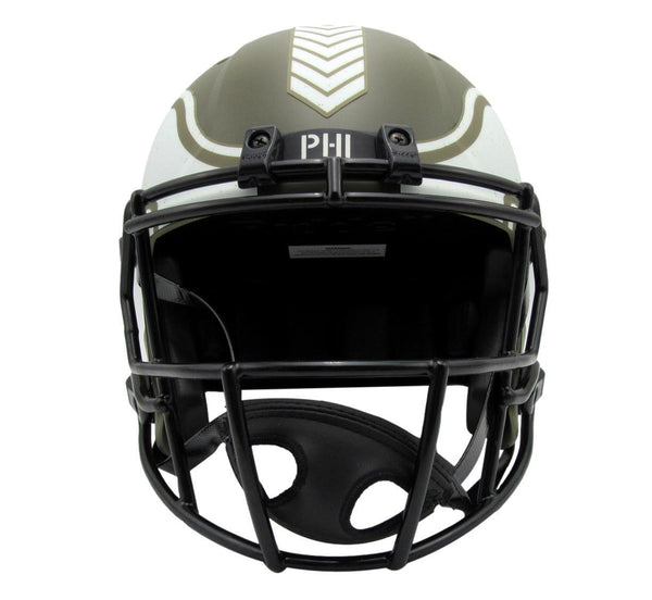 Devonta smith signed full size salute to service replica football helmet philadelphia eagles. this helmet is authenticated by fanatics authentic and includes their tamper-proof hologram sticker.