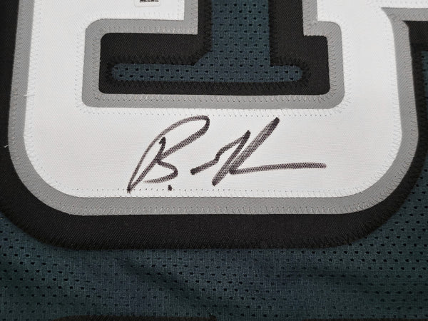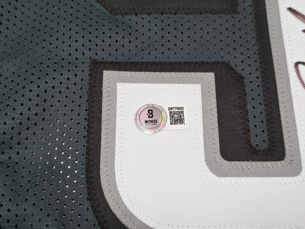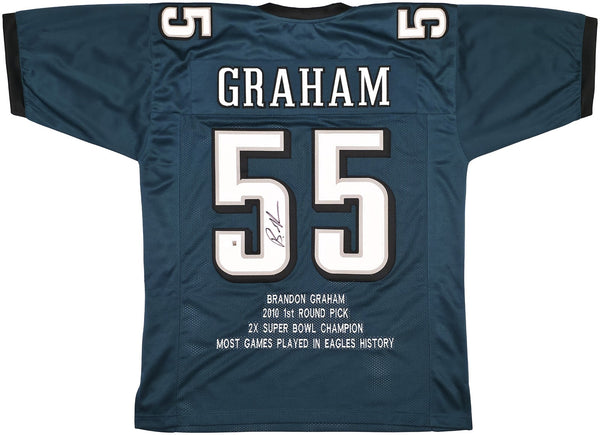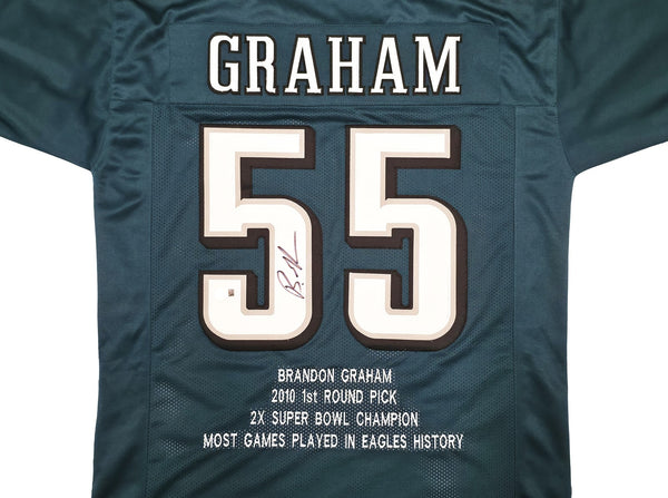 This is a Green Stat Jersey that has been hand signed by Brandon Graham. This is a custom jersey with no name brand. The approximate size is XL. It has nice sewn in name and numbers. This item has been witnessed and certified authentic by Beckett Authentication (BAS) and comes with their tamper-proof witness hologram.