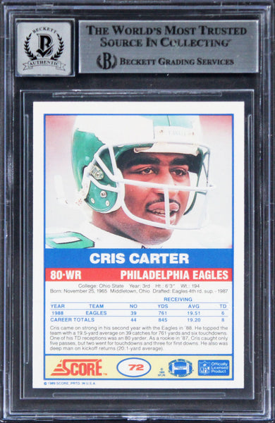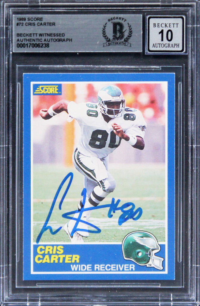 This Autographed Auto Graded Gem Mint 10! 1989 Score #72 Card has been Personally Signed by Cris Carter of the Philadelphia Eagles. This item is 100% Authentic, it comes slabbed and authenticated by Beckett Authentication Services. The authenticity can be verified on Beckett Authentication Services website. We only offers Authentic Autographs by Cris Carter through Signings, In-Person Signings or Private Collections to include a 100% money back Lifetime Authenticity Guarantee.