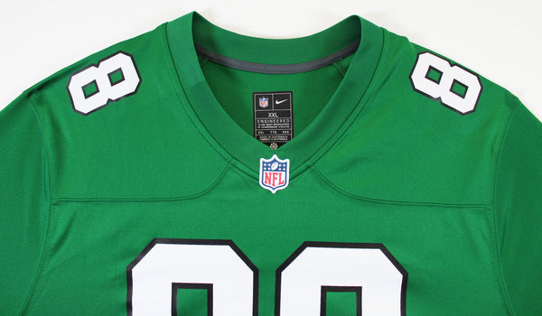 This Autographed Kelly Green Nike Game Jersey has been Personally Signed by Dallas Goedert of the Philadelphia Eagles. This item is 100% Authentic to includes a numbered hologram by Fanatics. We conducted an autograph signing with Dallas Goedert where multiples of the same item were signed. While the photographs are representative of this item, the size, placement and strength of the signature may vary. Each item is hand signed, therefore, each autograph is unique. This item can be verified through Fanatics. This is a X-Large sized Jersey.