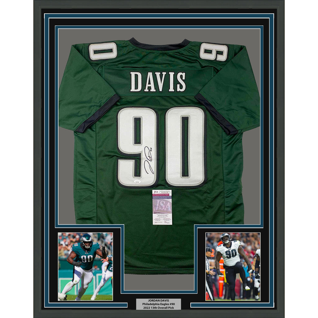 Framed Autographed/Signed Jordan Davis 35x39 Philadelphia Green Football Jersey The item is professionally framed and matted with two 5x7 photos, measures 35 inches by 39 inches and is ready to be hung in your man cave! Photo and matting requests can be made.