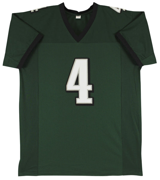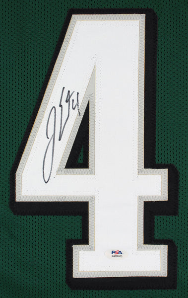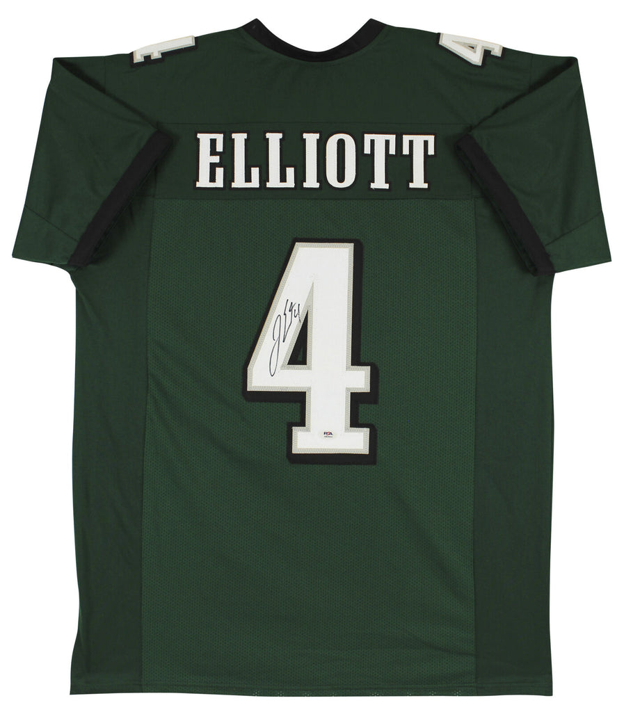 This Autographed Green Pro Style Jersey has been Personally Signed by Jake Elliott of the Philadelphia Eagles. This item is 100% Authentic and comes with a PSA/DNA Certification Card and a matching numbered Hologram. This is a PSA in the Presence Authenticated item which means a PSA representative was present when this item was being signed. We conducted an autograph signing with Jake Elliott where multiples of the same item were signed. While the photographs are representative of this item, the size, placement and strength of the signature may vary. Each item is hand signed, therefore, each autograph is unique. This item can be verified through PSA/DNA Itp. This is a X-Large sized, non-branded, custom-stitched Jersey.