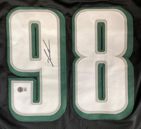 Featured is a Jalen Carter signed custom football jersey. This jersey was hand signed by Carter and comes with the Beckett hologram and certificate of authenticity. This jersey features professionally sewn letters and numbers and is size XL. This jersey has no team tags or emblems and is intended as a sports collectible. This jersey would make a great addition to any sports memorabilia collection.. SPECIFICATIONS Autographed By: Jalen Carter Team: Philadelphia Eagles Sport: Football Authentication: Beckett Grading Services
