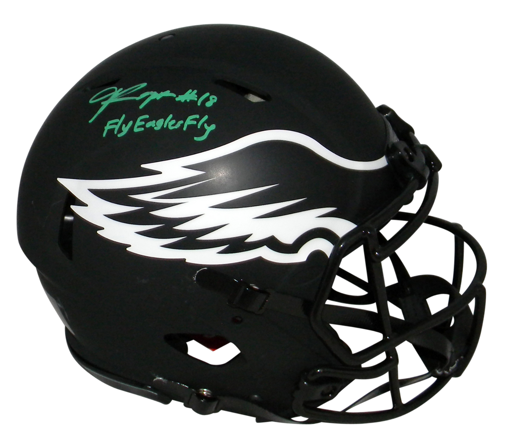 Jalen Reagor, first round draft pick for the Philadelphia Eagles, has hand signed this Eagles Riddell Speed Eclipse full-size authentic helmet at a private signing. He included the inscription "Fly Eagles Fly". This helmet is fully padded inside like the ones worn on the field. This item comes with a certificate of authenticity (COA) from Beckett Authentication Services and was signed in the presence of one of their representatives. You will receive a serial-numbered COA along with a matching serial-numbered sticker on the helmet. The authenticity can be verified online by entering the serial number.Item pictured may not be the exact item you will receive. It will be similar quality, and we guarantee your satisfaction.