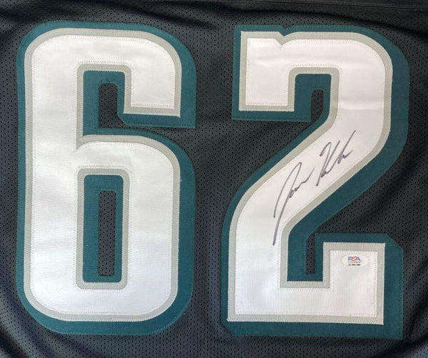 Custom on-field style jersey. Everything is sewn on, size XL. Hand-signed by Jason Kelce.The autograph(s) includes an official PSA/DNA hologram and QR Code card for authenticity purposes. The signing of this item was witnessed by PSA.Authentication: PSA QR Code card