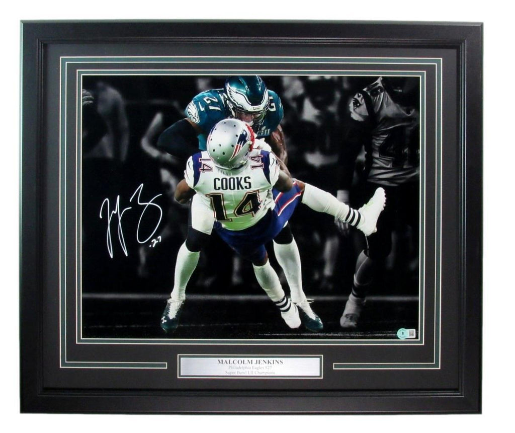 Malcolm Jenkins Signed 16x20 Photo Philadelphia Eagles Framed. The outer frame size is 26 inches x 22 inches. This photo is authenticated by BAS/Beckett and includes their Tamper-proof Hologram Sticker.