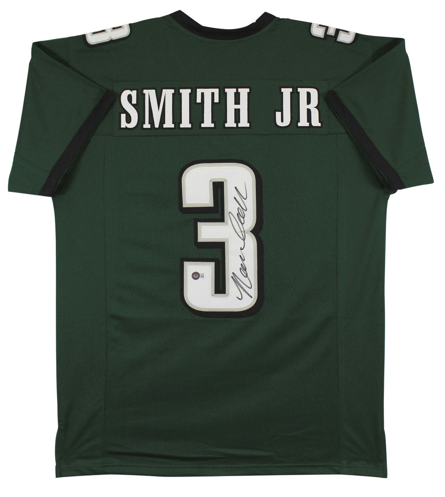 This Autographed Green Pro Style Jersey has been Personally Signed by Nolan Smith of the Philadelphia Eagles. This item is 100% Authentic to include a hologram by Beckett Authentication Services. This item will come with an affixed Beckett Authentication Services (BAS) authentication sticker, which includes a scannable QR code to verify authenticity. Please note that Beckett no longer provides serial-numbered COA cards, and the attached BAS sticker will serve as the complete authentication for this item. This is a BAS Witnessed Protection Program item which means a Beckett Authentication Service representative was present when this item was being signed. We conducted an autograph signing with Nolan Smith where multiples of the same item were signed. While the photographs are representative of this item, the size, placement and strength of the signature may vary. Each item is hand signed, therefore, each autograph is unique. This item can be verified through BAS Witnessed. This is a X-Large sized, non-branded, custom-stitched Jersey.