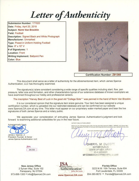The number in the listing title is just an inventory sku for our records and is not the authentication number. This is the exact item that you will receive so please see pictures for condition. This is an 8x10 photo that was personally autographed by Norm Van Brocklin with "Harvey" Best of luck in the good all college side inscription. Includes a certificate of authenticity from James Spence Authentication (JSA) and Denver Autographs.FREE SHIPPING within the USA on orders over $10!
