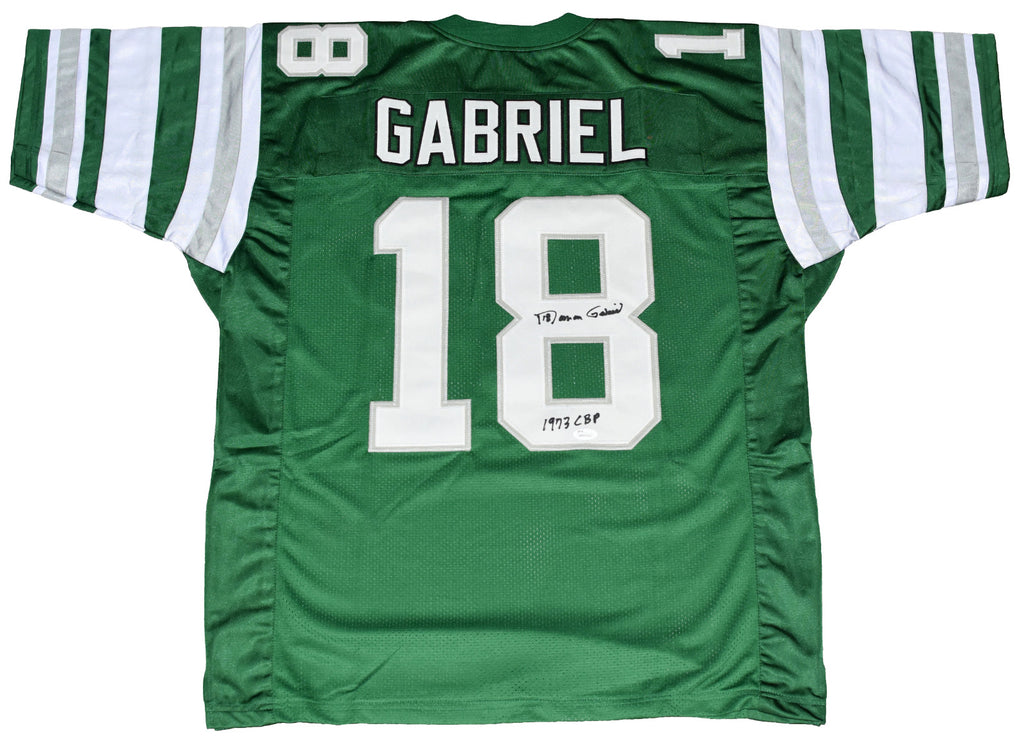 Roman Gabriel, former star quarterback for the Philadelphia Eagles, has hand signed this green custom jersey at a private signing. Jersey is size XL and all letters/numbers are sewn-on. This item comes with a certificate of authenticity (COA) from JSA - James Spence Authentication and was signed in the presence of one of their representatives. You will receive a serial-numbered COA along with a matching serial-numbered sticker on the jersey. The authenticity can be verified online by entering the serial number.Item pictured may not be the exact item you will receive. It will be similar quality, and we guarantee your satisfaction.