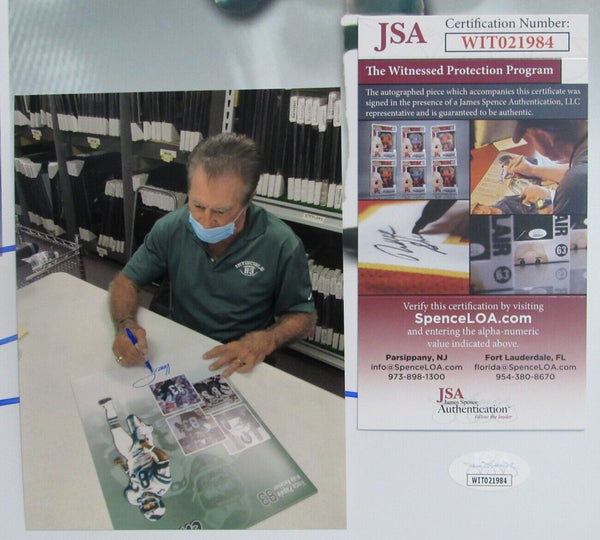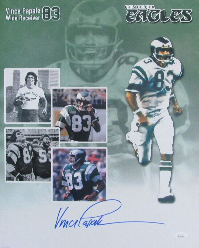 Vince Papale Philadelphia Eagles Autographed/Signed 16x20 with a Collage of Photos on it. It is a hand Signed 16x20 inch photo authenticated by JSA and comes with their tamper proof numbered sticker and matching certificate.