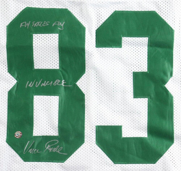 Custom on-field style jersey. Everything is sewn on, size XL. Hand-signed and inscribed by Vince Papale.The lot / autograph(s) includes an official All World Memorabilia hologram for authenticity purposes.Authentication: All World Memorabilia Hologram