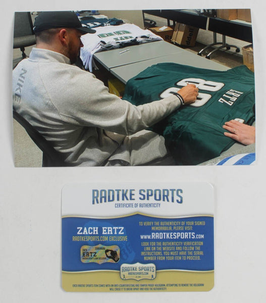 Custom on-field style jersey with everything sewn on, size XL. Has been hand-signed by Zach Ertz.The lot / autograph(s) includes an official exclusive Zach Ertz hologram and COA from Radtke Sports. Also includes a photo for proof.Authentication: Radtke COA