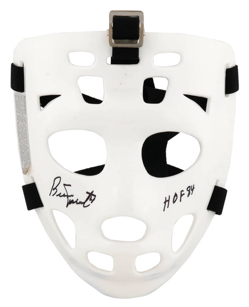 Bernie Parent signed white with black straps throwback hockey goalie mask with 'HOF 84' inscription. Item comes with a Schwartz Sports Memorabilia tamper-proof numbered hologram and Certificate of Authenticity which can be verified online.